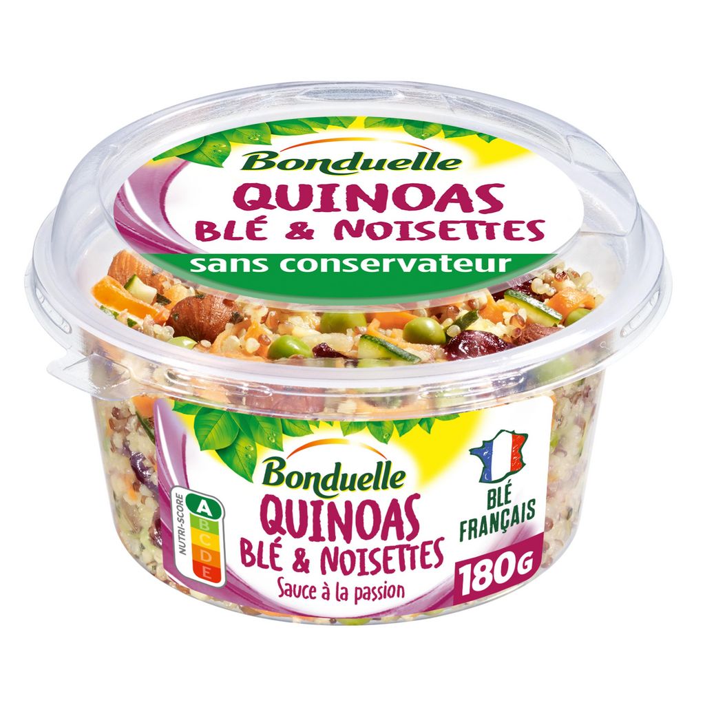 Salade assaisonnée de quinoas précuits réhydratés semoule de blé dur réhydratée, noisettes entières et jus de fruit de la passion