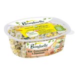 Ingrédients : Ingrédients:Riz cuit 45% (eau, riz 19%), concombres 14%, maïs doux 14%, SAUMON Salmo Salar cuit 7% (SAUMON Salmo Salar 7%, sel), huile de colza, oignons, FROMAGE blanc 0% de matières grasses 2% (LAIT écrémé pasteurisé, ferments LACTIQUES), ciboulette, pur jus de citron 1,5%, vinaigre d'alcool, MOUTARDE de Dijon, sel, épaisissants: gomme de xanthane et gomme de guar.