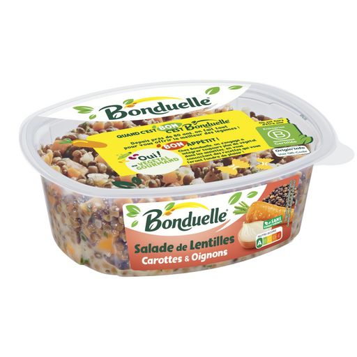 Ingrédients : Ingrédients:Lentilles vertes cuites 52%, carottes 26%, eau, huile de colza, vinaigre d'alcool, MOUTARDE à l'ancienne (eau, vinaigre d'alcool, graines de MOUTARDE, téguments de graines de MOUTARDE, sel, arômes, épice), ciboulette, MOUTARDE de Dijon, oignons réhydratés 0,8%, sel, poivre, épaisissants: gomme de xanthane et gomme de guar. Fabriqué dans un atelier utilisant également : gluten, fruits à coques, soja, lait, œuf, céleri, poisson, crustacé.