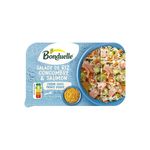 Riz cuit 43% (eau, riz), concombre 14,5%, condiments de légumes 8% [carottes, eau, patate douce, pois chiche, huile de colza, ciboulette, lait de noix de coco (lait), vinaigre d'alcool, sel, concentré de jus de citron, MOUTARDE de Dijon, curcuma], SAUMON Salmo Salar cuit 6,5% (SAUMON Salmo Salar, sel), carottes 5,5%, fèves de SOJA 4%, huile de colza, chou blanc 3%, sucre, eau, vinaigre de riz, vinaigre d'alcool, germes de maïs toastés, MOUTARDE de Dijon, sel, coriandre, épaississants: gomme de xanthane et gomme de guar.