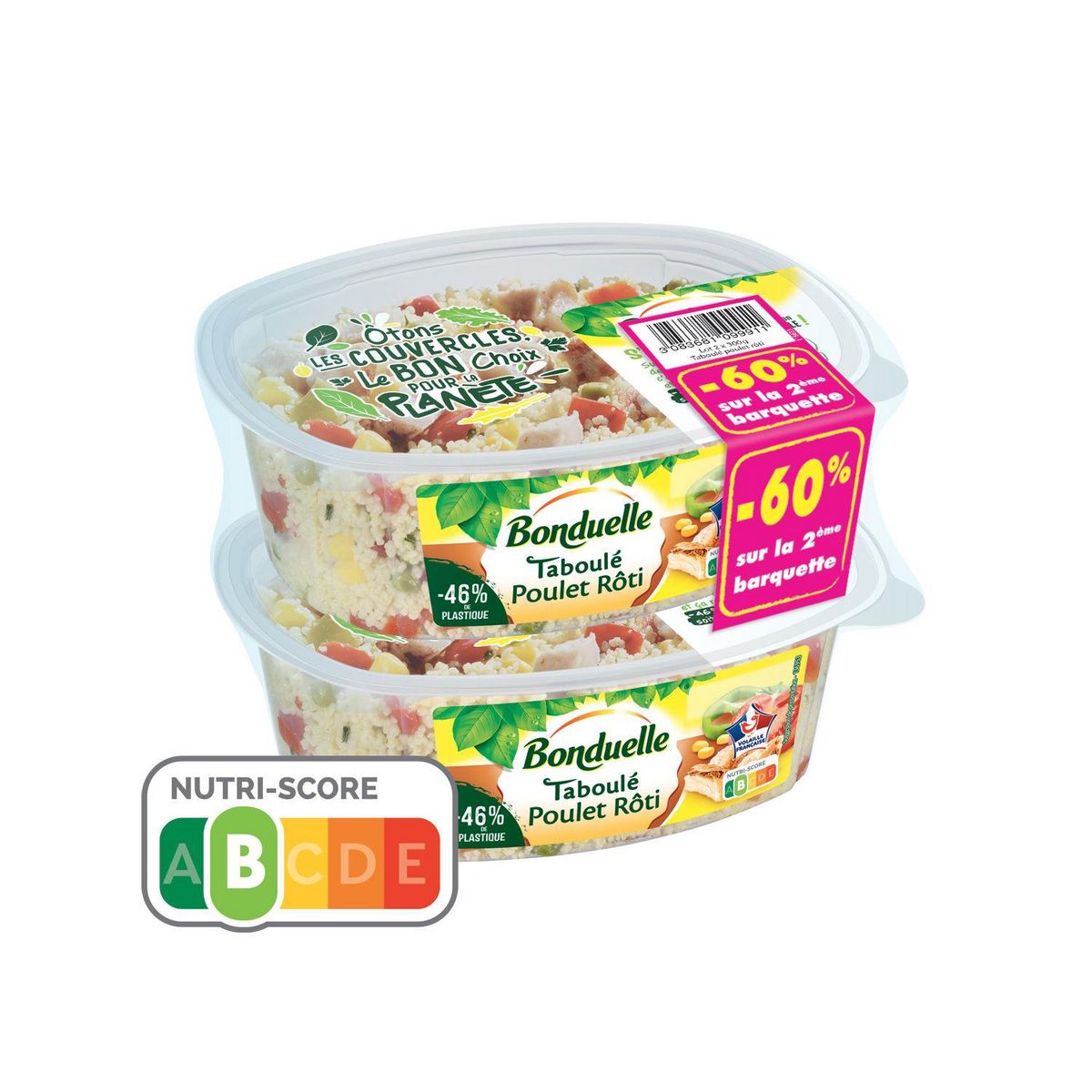 Acheté en promotion, le lot de 2 barquettes est intéressant. Le taboulé au poulet est bon. Je l'achète souvent