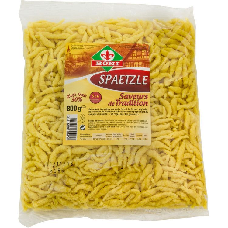 Ingrédients : farine de BLE (farine de blé, gluten de blé, agent de traitement de la farine : acide ascorbique, levure), OEUFS frais (30%), eau, huile de tournesol, sel, acidifiant : acide citrique