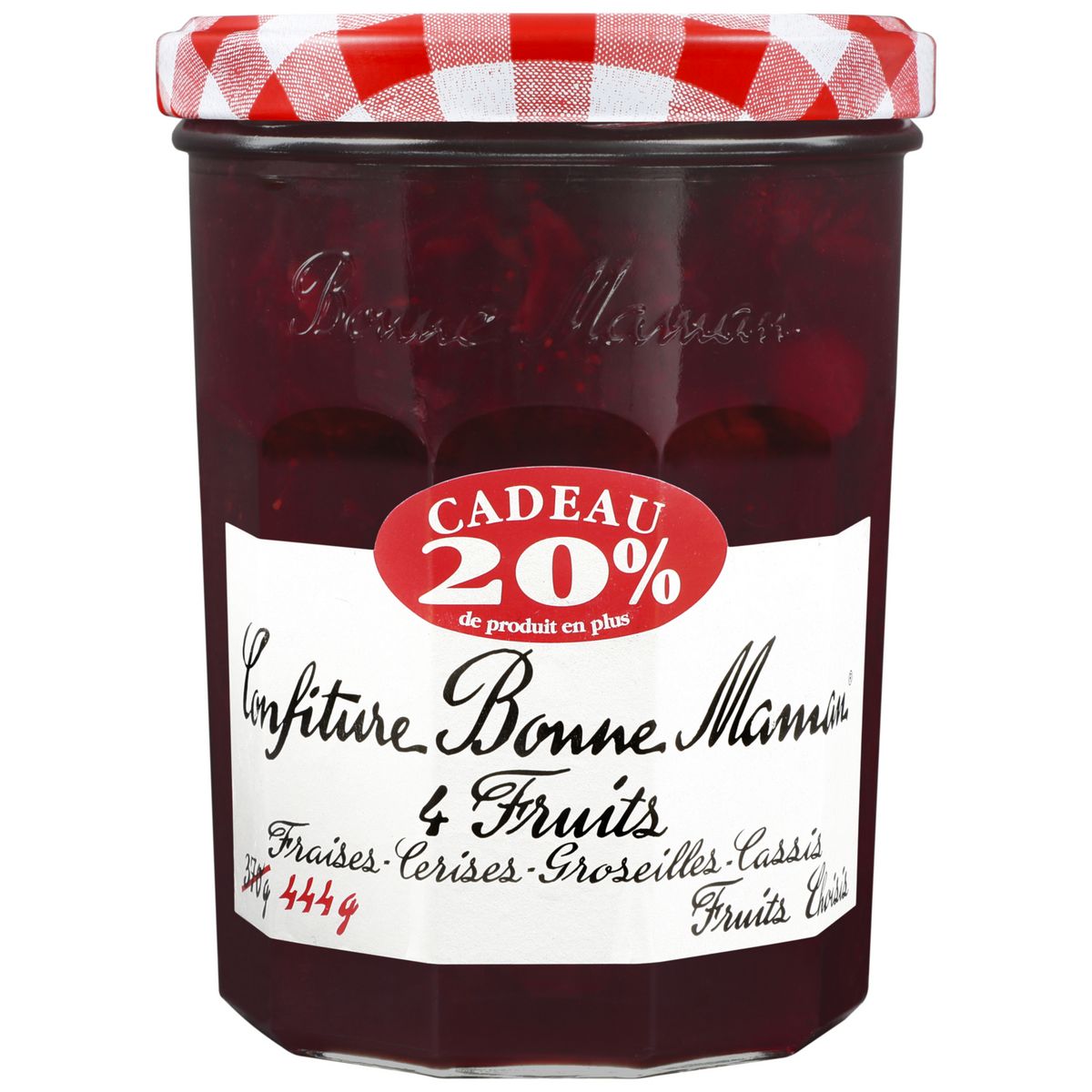 Ingrédients : Ingrédients : fruits (fraises 20%, cerises 15%, groseilles 12%, cassis 3%), sucre, sucre roux de canne, jus de citrons concentré, gélifiant : pectines de fruits.