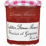 Ingrédients : Ingrédients : fruits (fraises 32%, goyaves 18%), sucre, sucre roux de canne, jus de citrons concentré, gélifiant : pectines de fruits.