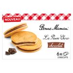 Découvrez La Pause Choco Bonne Maman, deux biscuits fins délicieusement sablés associés à un généreux fourrage au chocolat.