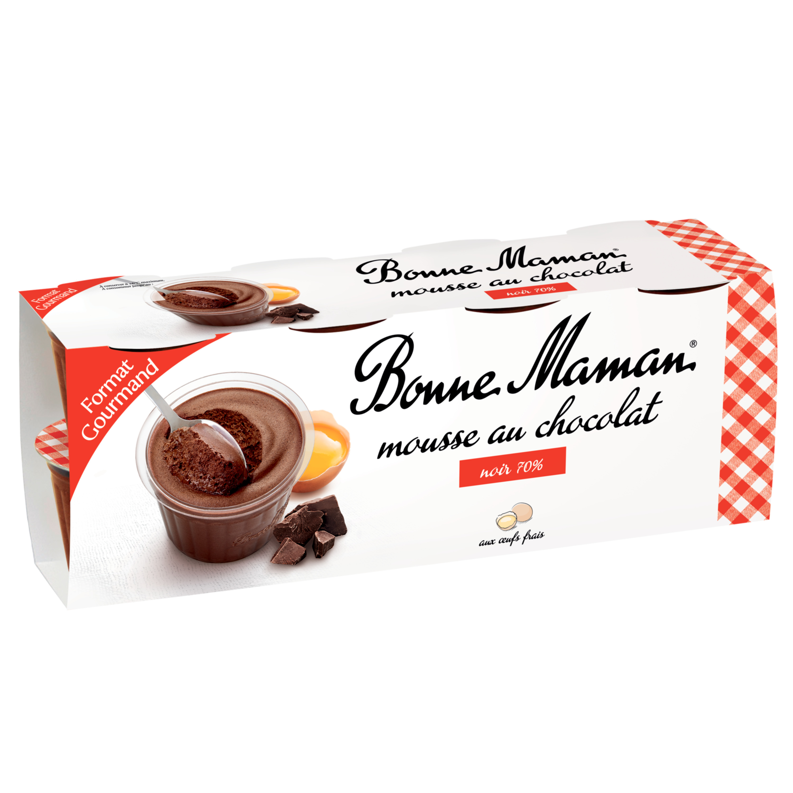Grâce à son inimitable savoir-faire et à la qualité de ses ingrédients, Bonne Maman vous offre le meilleur, pour votre plus grand plaisir, tout simplement. Cédez avec délice à l'intensité du cacao. L'alliance du chocolat noir intense et de la mousse aux oeufs frais ferme et délicate font de cette recette goûteuse un dessert incontournable. Un format généreux pour les plus gourmands. Mousse aux Chocolats et aux œufs frais