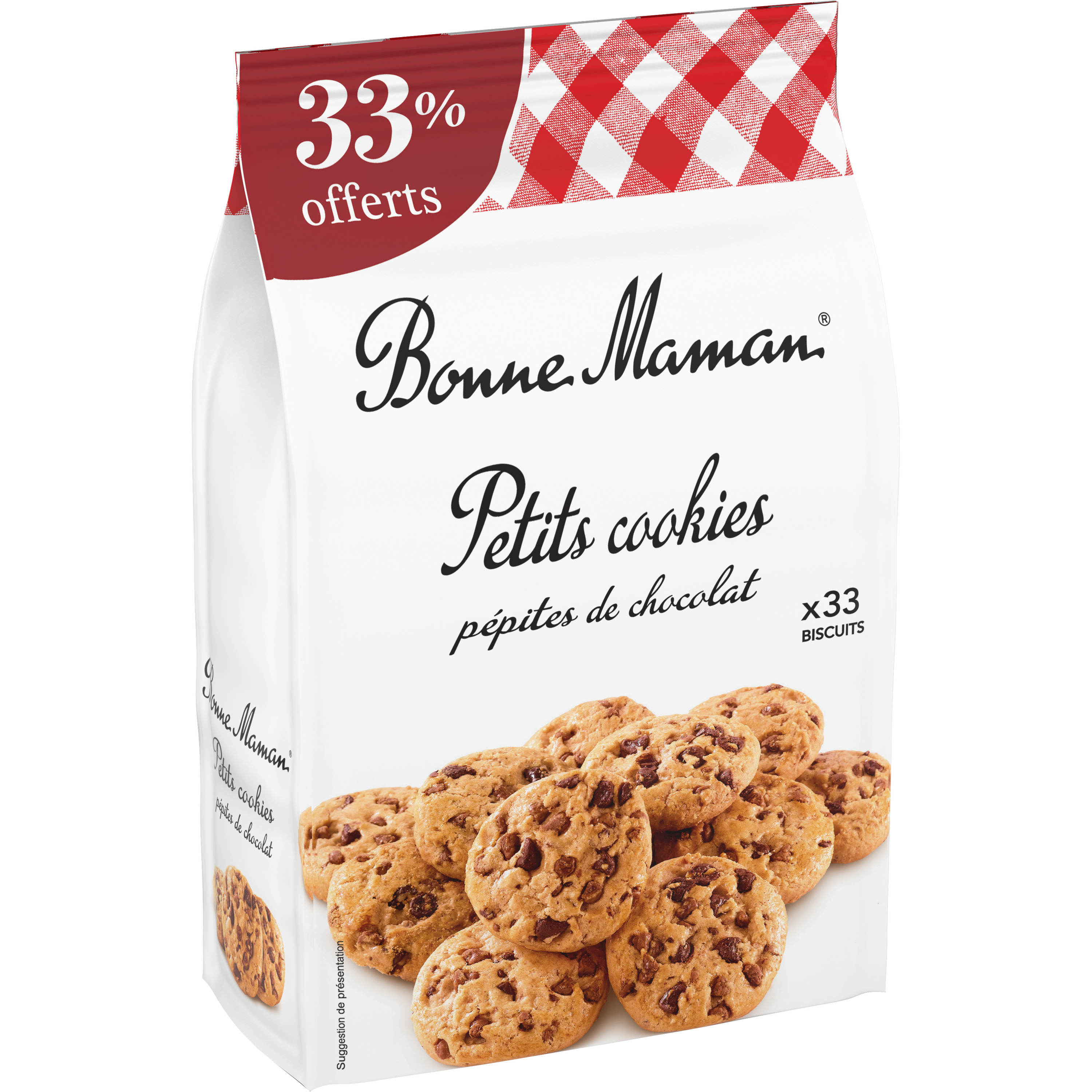 Ingrédients : farines de céréales (farine de BLE tendre, farine d'AVOINE), pépites de chocolat 33% (sucre, pâte de cacao, LAIT en poudre, beurre de cacao, LACTOSE, émulsifiant : lécithines (SOJA), arôme naturel de vanille, cacao maigre en poudre), BEURRE, sucre, OEUFS frais, poudres à lever : carbonates de sodium et acide citrique, fibres de BLE, arôme naturel, sel, LAIT écrémé en poudre. Traces éventuelles de soja, de graines de sésame et de fruits à coque.