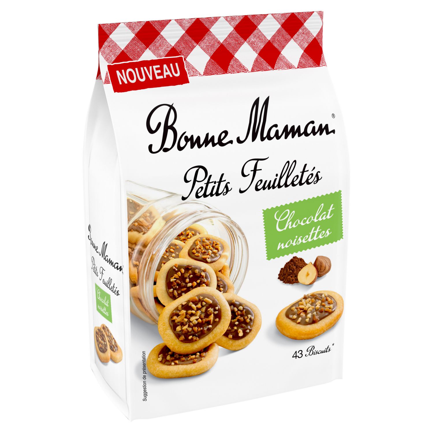Découvrez les Petits Feuilletés Bonne Maman, des biscuits au délicat feuilletage et au fourrage chocolat fondant saupoudré d'éclats de nougatine pour plus de gourmandise !