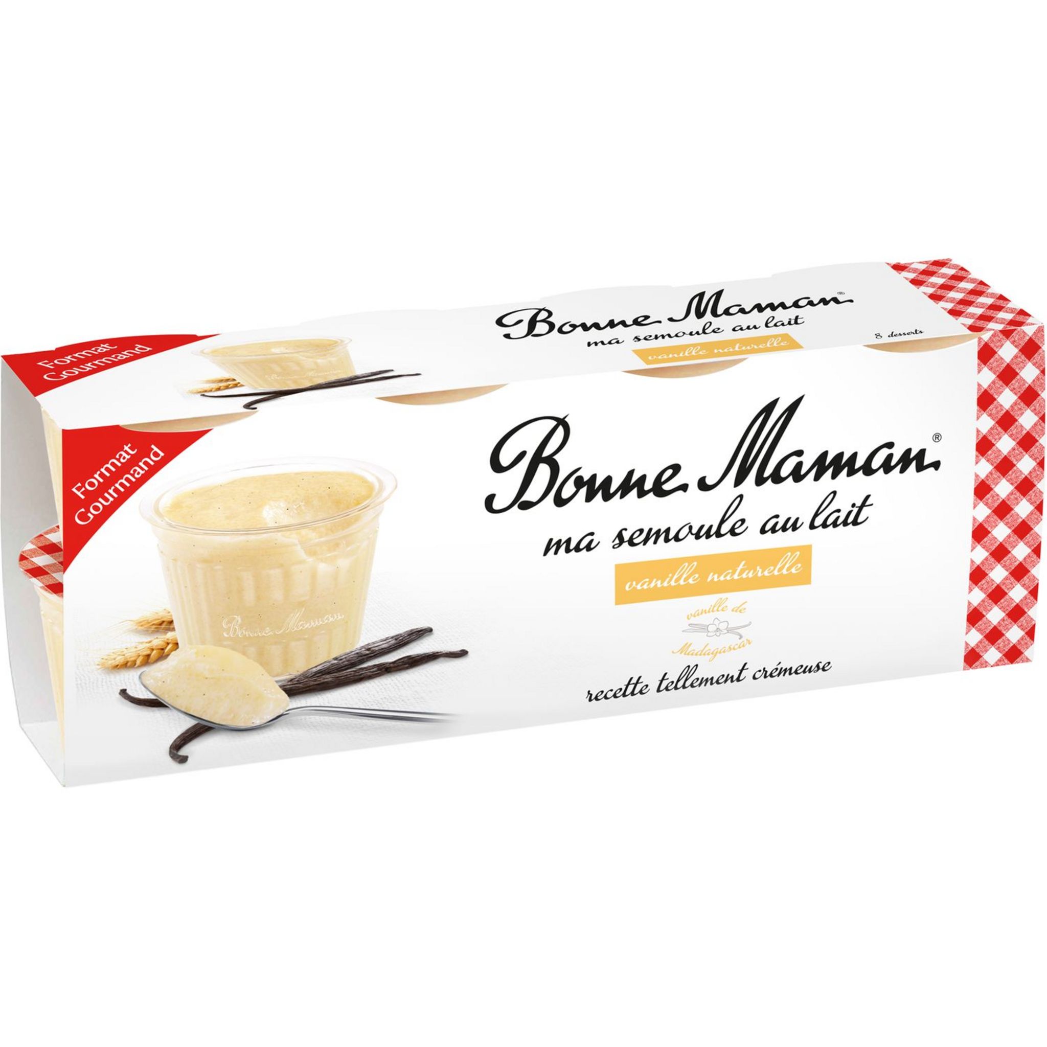 Pour préparer sa semoule au lait, Bonne Maman utilise du bon lait entier frais, une pluie de semoule dorée, et sa fameuse vanille naturelle de Madagascar, sélectionnée avec soin. La cuisson lente, sans jamais cesser de mélanger, permet d’obtenir cette texture unique et crémeuse. Semoule au lait à la vanille