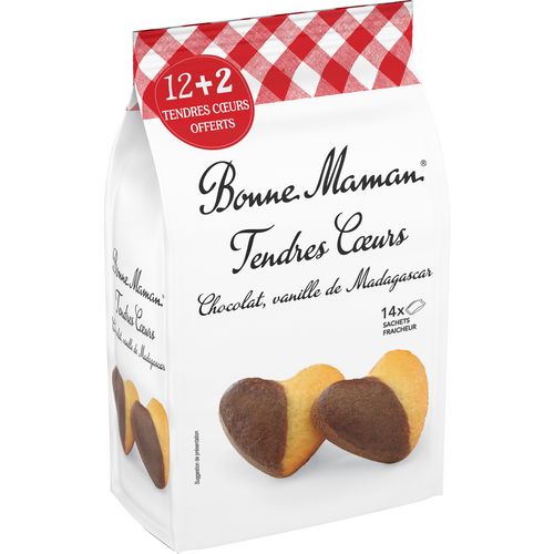 Grâce à son inimitable savoir-faire et à la qualité de ses ingrédients, Bonne Maman vous offre le meilleur, pour votre plus grand plaisir, tout simplement. De délicieux cœurs pur beurre marbrés avec une pâte au bon goût de vanille de Madagascar et au bon chocolat. Pour préserver toute sa saveur et son moelleux, chaque tendre coeur Bonne Mamn est emballé avec soin dans son petit sachet fraicheur.