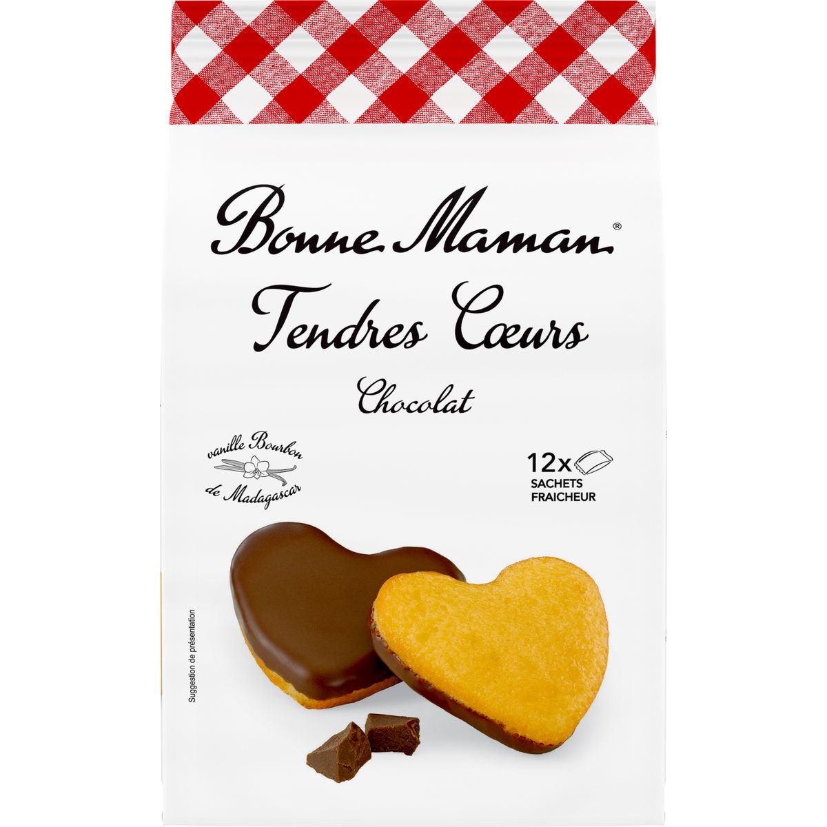 Grâce à son inimitable savoir-faire et à la qualité de ses ingrédients, Bonne Maman vous offre le meilleur, pour votre plus grand plaisir, tout simplement. De délicieux cœurs moelleux délicatement nappés au bon chocolat. Pour préserver toute sa saveur et son moelleux, chaque tendre coeur Bonne Maman est emballé avec soin dans son petit sachet fraicheur.