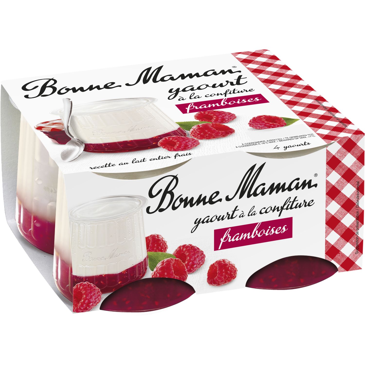 Ingrédients : Yaourt brassé sucré 72%: LAIT entier frais, CREME fraîche, sucre 2,5%, ferments lactiques (LAIT). Confiture de framboises allégée en sucres bonne maman (30% de sucres en moins) 28%: framboises 60%, sucre, gélifiant : pectine de fruits.