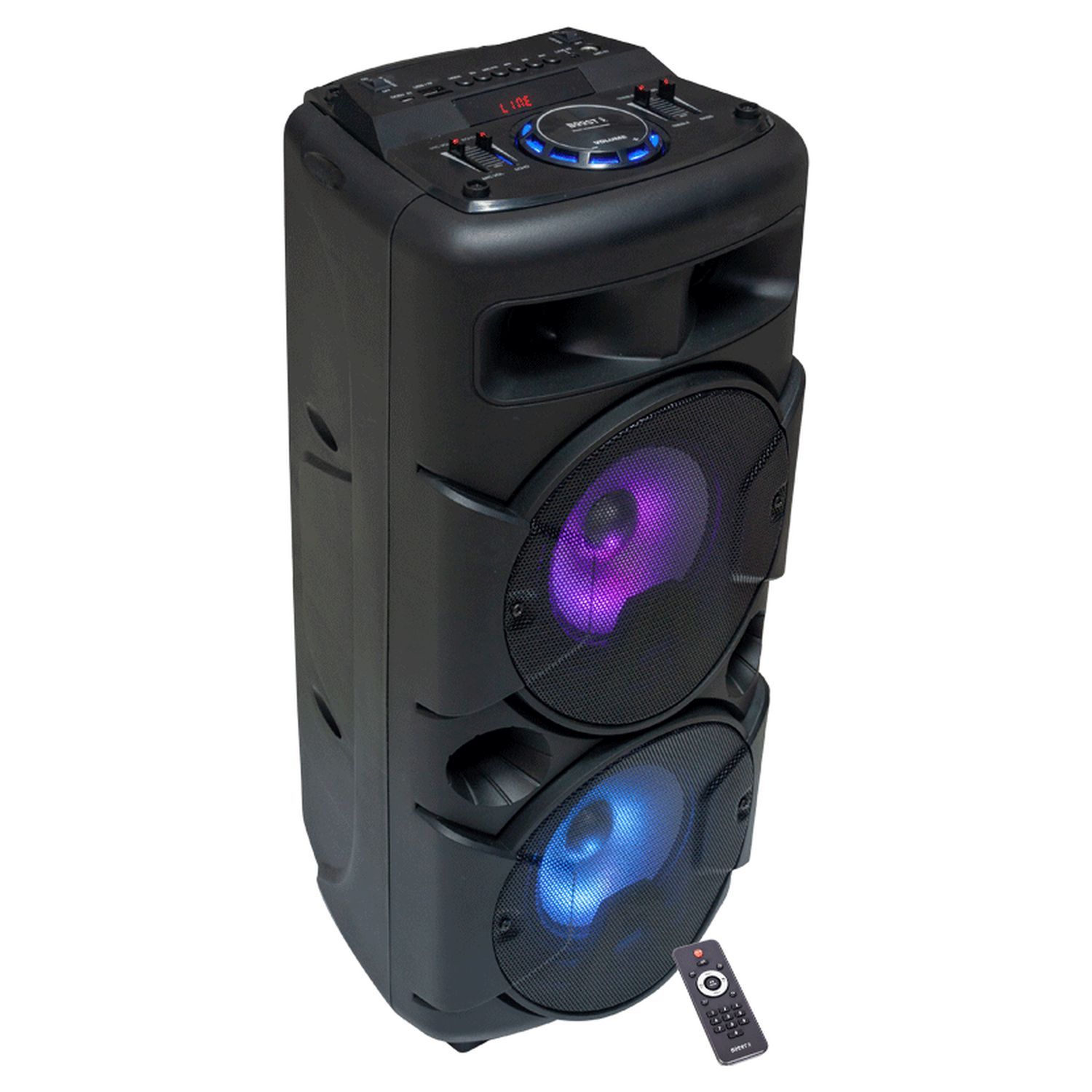 2 boomers de 16 cm - Tweeter - Autonomie jusque 5 h - Effets LED - Télécommande - Entrée USB et micro-SD - Entrée micro avec fonction Echo et Priorité - Cordon de charge