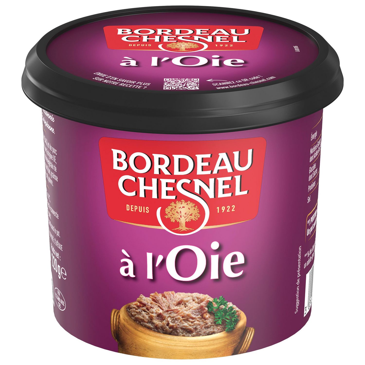 Ingrédients : Viande d'oie d'origine UE, viande de porc d'origine France, huile végétale de coprah, huile végétale de colza, peau d'oie, graisse d'oie, miel, vinaigre d'alcool, sel, poivre.