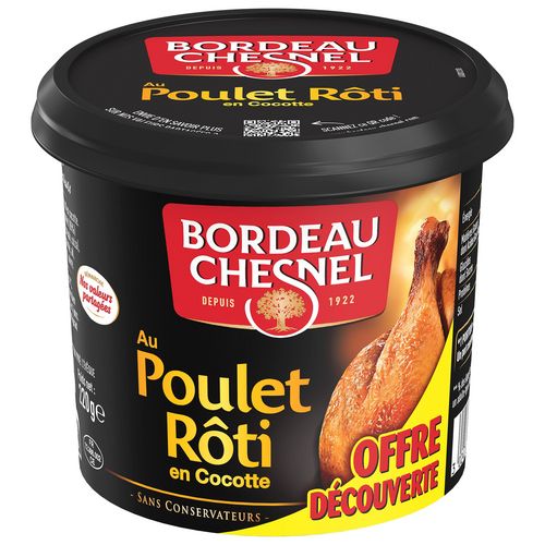 Depuis 1922, la maison Bordeau Chesnel créée par Anna Chesnel et Jules Bordeau se distingue par sa longue tradition au service d'une charcuterie d'excellence. Notre recette au Poulet Rôti en Cocotte est cuisinée à partir de viande de poulet soigneusement sélectionnée. Cette viande est longuement confite (6 à 8 heures) et soigneusement assaisonnée, ce qui procure un goût inimitable et une texture fondante. Notre recette est sans conservateur.