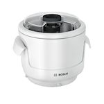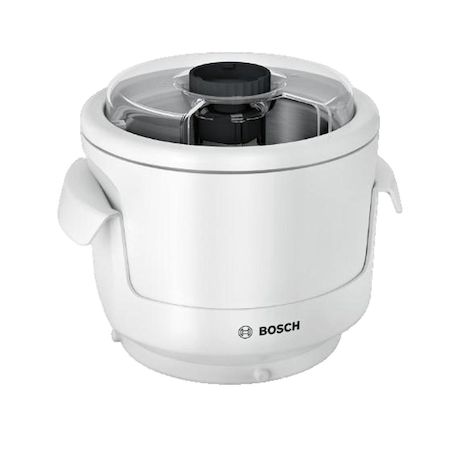 L'accessoire de fabrication de glace Bosch MUZ9EB1 permet de préparer facilement de la glace, du sorbet ou du yaourt glacé en seulement 30 minutes. Il est fabriqué en plastique durable et en acier inoxydable et comprend un récipient de refroidissement à double paroi garantissant des résultats optima