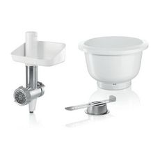 Le bol en plastique peut contenir jusqu'à 1000 g de farine et ingrédients supplémentaires, selon les performances du moteur de votre machine. Le hachoir à viande est équipé d'un disque perforé en acier inoxydable de 4,5 mm et d'une lame, permettant un hachage efficace des viandes. Les accessoires sont conçus pour être compatibles avec les machines à cuisine MUM5 de Bosch, facilitant ainsi la préparation de divers plats.