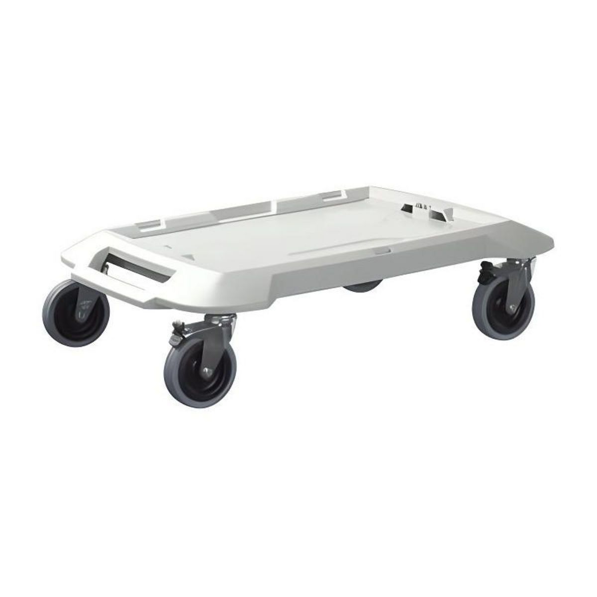 Systeme de verrouillage par clic assurant un maintien parfait des coffrets L-BOXX empilés pour un transport en toute sécurité Bonne stabilité et grande robustesse grâce a la capacité de charge de 100 kg 4 roulettes (dont 2 verrouillables) pour une grande liberté de mouvement