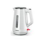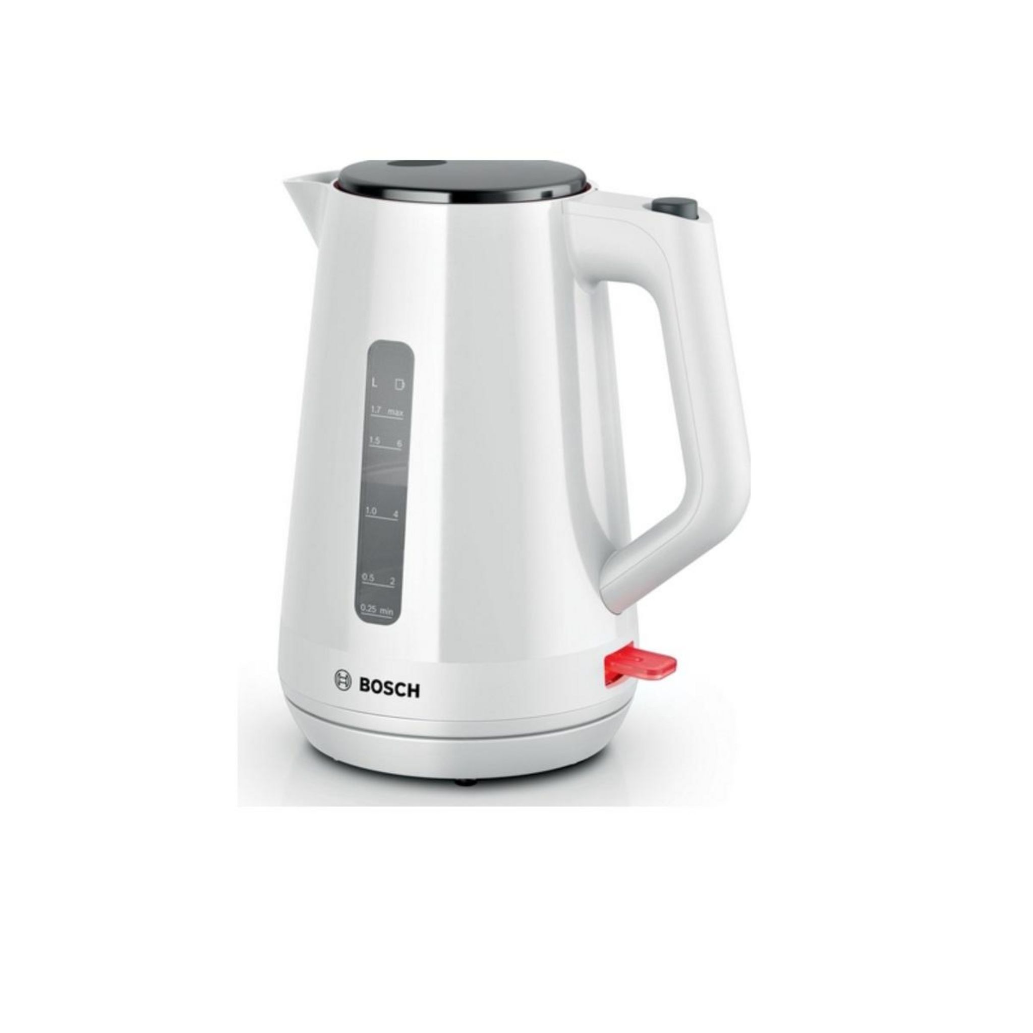 Bosch TWK1M121 La bouilloire Bosch TWK1M121 avec une manipulation pratique et un indicateur de niveau. Le design attrayant avec ses reflets mats et brillants donne de la vie à la cuisine. Ouverture du couvercle avec une seule main. Indicateur de tasse : économiser de l'énergie et du temps en ne faisant bouillir que la quantité dont vous avez besoin. Filtre anti-calcaire : amovible et facile à nettoyer, il empêche le calcaire de s'infiltrer dans vos boissons. Niveau d'eau facile à lire : Chauffez que la quantité d'eau requise. Triple sécurité : Arrêt automatique à l'ébullition, protection contre la surchauffe et arrêt lors du soulèvement du socle.