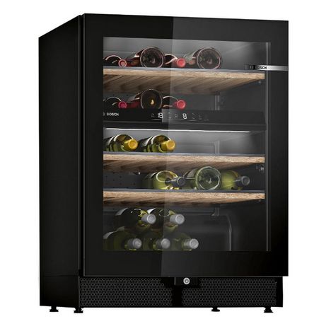 Bosch KWK16ABGB Cave à vin double zone Série 6 Bosch KWK16ABGB avec porte en verre. Éclairage LED avec mode présentation : un éclairage idéal pour votre cave à vin. Clayettes en chêne avec rails télescopiques : vos vins à l'abri des chocs et vibrations. Charnière interchangeable : ouvrez la porte de votre cave à vin du côté que vous souhaitez. Serrure de porte : soyez assuré que vos vins sont stockés en toute sécurité.