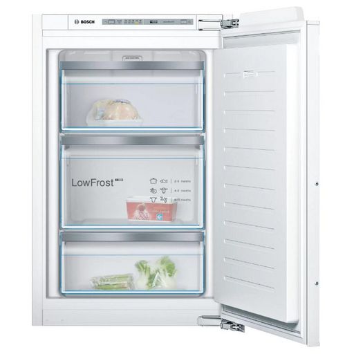 Bosch GIV21AFE0 Le congélateur intégrable Série 6 Bosch GIV21AFE0 avec 3 tiroirs transparents et sa fonction SuperFreezing : congèle les aliments encore plus rapidement. Super-congélation automatique : optimal pour congeler vos aliments encore plus vite, tout en préservant les aliments déjà présents dans le congélateur. L'appareil détecte automatiquement l'augmentation de température lorsque vous introduisez de nouveaux aliments à l'intérieur. BigBox : compartiment pour les grands produits surgelés. Low Frost : décongeler moins souvent grâce à la faible quantité de formation de glace - pour un gain de temps et des économies en énergie. Classe d'efficacité énergétique A++ : système de refroidissement économique.