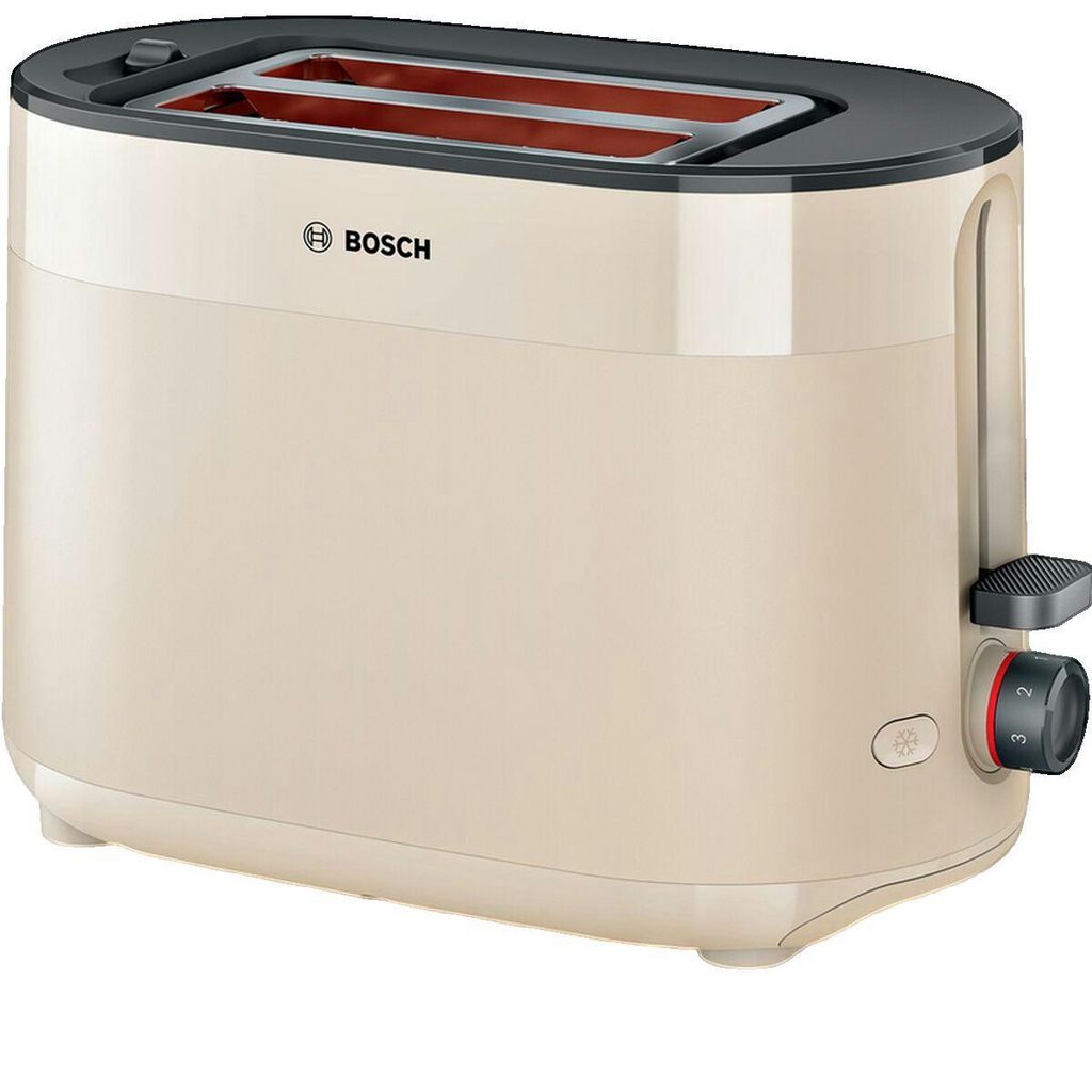 Découvrez le grille-pain Bosch TAT2M127, un appareil compact et pratique idéal pour griller du pain dans votre cuisine. Ce grille-pain beige offre une capacité de deux tranches et une puissance de 950 W pour un grillage parfait. Il dispose de fonctions de décongélation et de réchauffage, ainsi que d