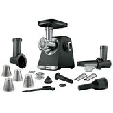 Le hachoir à viande Bosch Série 6 MFWS660B est un appareil de cuisine performant et polyvalent. Il dispose d'une puissance de 500 W avec un moteur pouvant atteindre 2100 W, permettant de hacher jusqu'à 3,5 kg de viande par minute. Equipé de 2 vitesses, d'une fonction marche arrière, d'un couteau à double aiguisage, et de 3 grilles de hachage, il inclut également un kit kebbés, un embout pour saucisses, un râpeur/éminceur avec 4 tambours, et un extracteur de jus. Son design élégant noir s'intègre parfaitement dans toutes les cuisines. Dimensions : 50 cm (largeur) x 29 cm (profondeur) x 31 cm (hauteur). Poids : 6.69 kg. Cordon de 1 m avec rangement intégré. Pieds antidérapants pour une meilleure stabilité. Une brosse de nettoyage est fournie.
