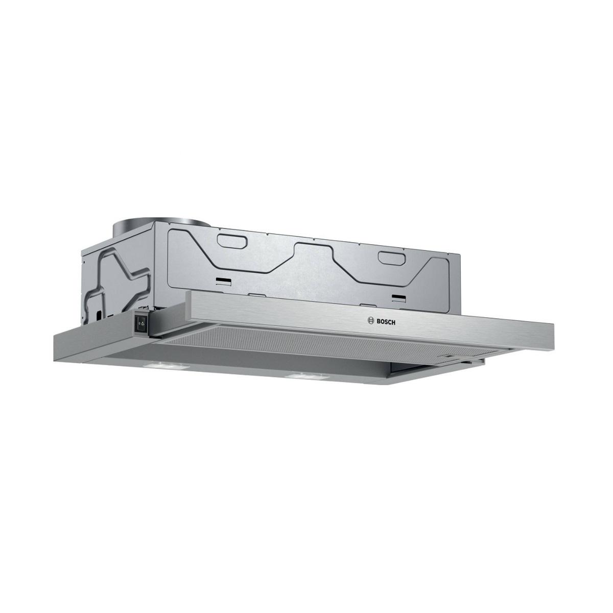 Bosch DFM064W54F La hotte télescopique DFM064A53F de Bosch assure un design épuré au sein de la cuisine, à peine visible, intégrée dans l'élément mural. Elle offre 3 vitesses d'aspiration avec un débit d'aspiration maximale de 388 m3,/h