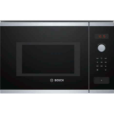Bosch BFL553MS0 Le micro-ondes encastrable Série 4 Bosch BFL553MS0 pour une niche de 38 cm : pour décongeler, réchauffer et préparer rapidement vos plats.Fonction micro-ondes : pour décongeler, réchauffer et préparer rapidement vos plats.Porte électronique : ouverture confortable de la porte grâce à une touche senseur.Display LED, rouge : facile à utiliser, grâce aux fonctions de temps.Programmateur électronique de 99 min à affichage digital.5 Puissances micro-ondes : 90 W, 180 W, 360 W, 600 W, 900 W.Volume 25 l.Confort/Sécurité :Horloge électronique.Bouton à prise centrale, Boutons escamotables, commandes par touchControl.Cavité Acier inox.Charnières à gauche.Plateau tournant en verre : 31,5 cm.7 programmes automatiques.4 décongélation et 3 en fonction micro ondes.Fonction mémoire (1 position).Eclairage LED.