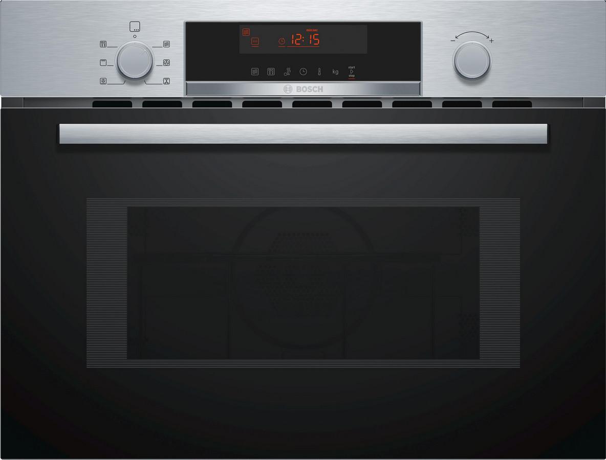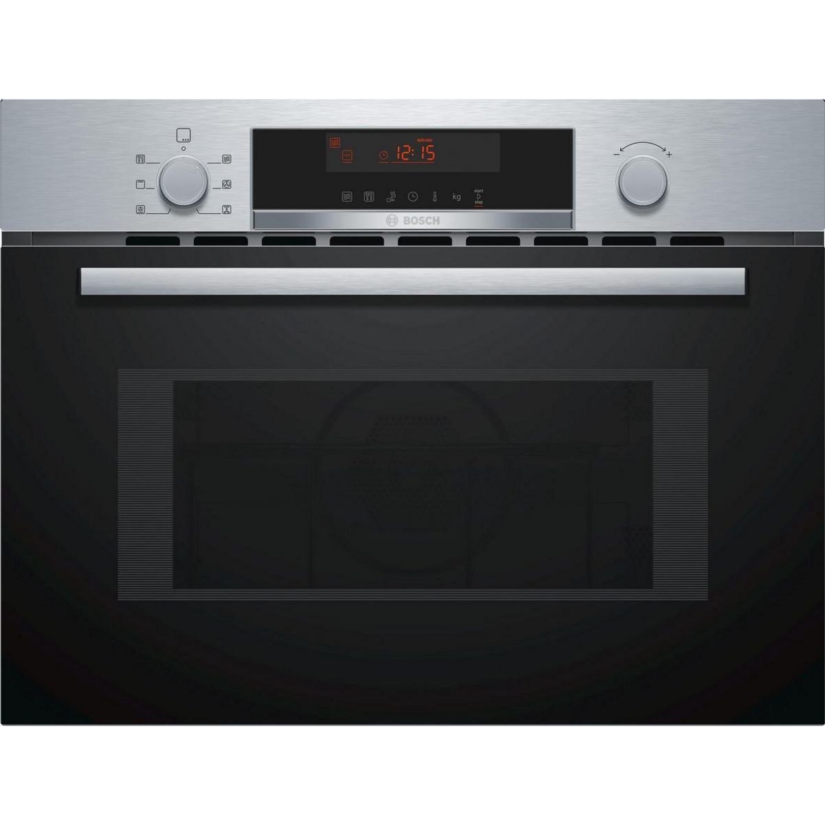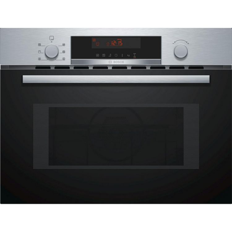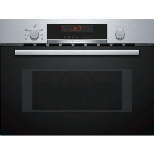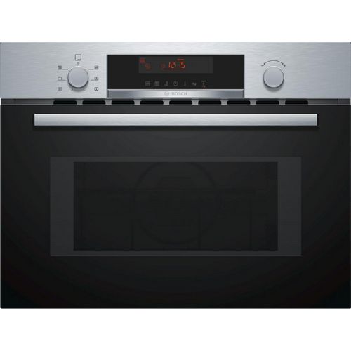 Bosch CMA583MS0 Micro-onde Bosch CMA583MS0 encastrable 45 cm : pour décongeler, réchauffer et préparer rapidement vos plats.- Air pulsé : résultats de cuisson parfaits grâce à la répartition de la chaleur de façon homogène.- Cavité en inox : facile à nettoyer grâce à la surface lisse.Design :Bouton à prise centrale, Boutons escamotables, commandes par touchControlCavité Acier inoxType de four/Modes de cuisson :Volume 44 l15 programmes automatiques5 Puissances micro-ondes : 90 W, 180 W, 360 W, 600 W, 900 WPuissance du gril et du Micro ondes 90 W, 180 W, 360 W, 600 W combinableGril de 1.75 kW4 modes de cuisson : Micro-ondes , gril air pulsé, gril grande surface, position pizzaRéglage de la température : 40 °C - 230 °CConfort/Sécurité :Horloge électroniqueEclairage LEDPlateau tournant émaillé : 36 cmInterrupteur au contact de la porteVentilateur de refroidissement.