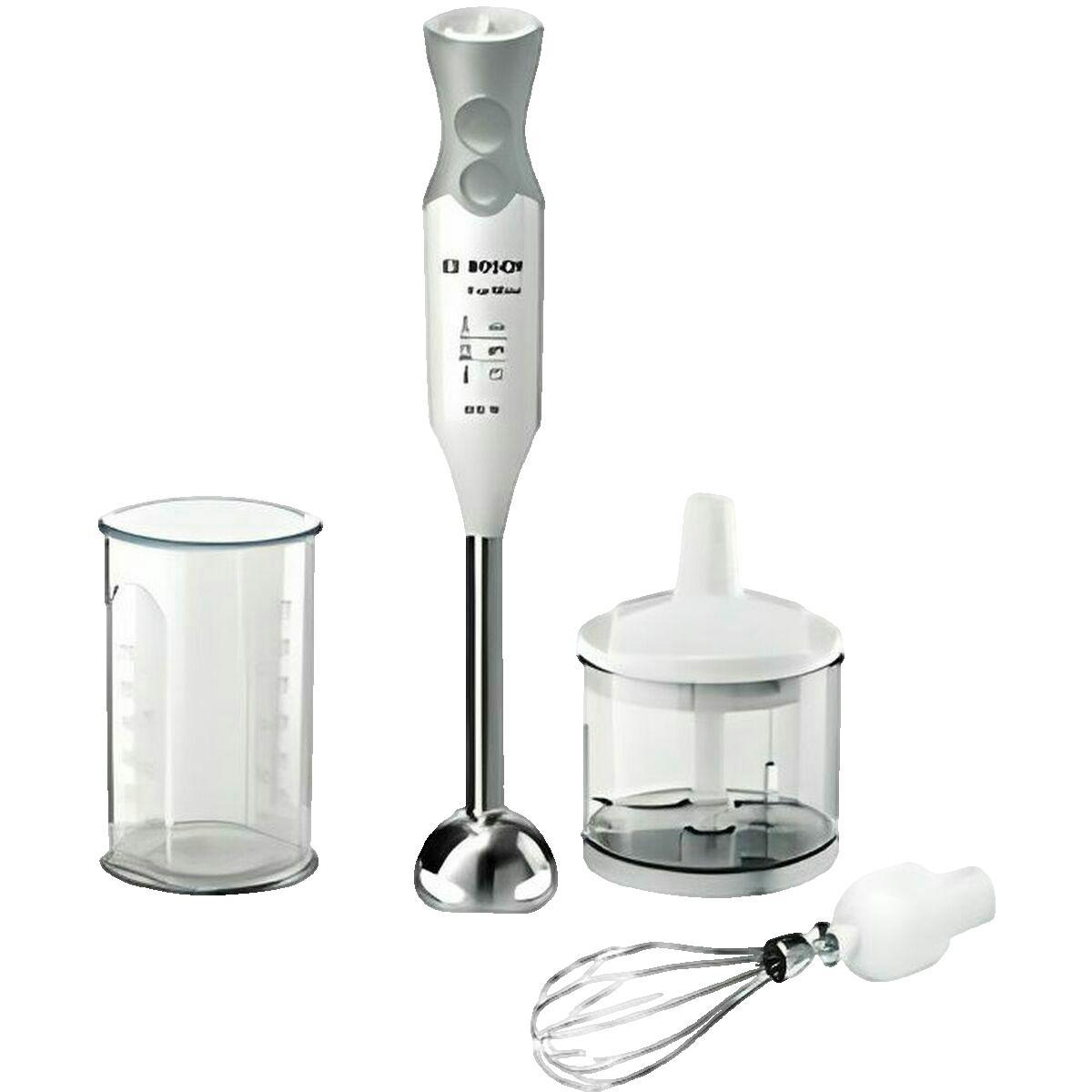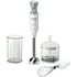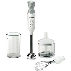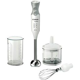 Le mixeur plongeant Bosch MSM66150 est un appareil de cuisine performant doté d'un pied inox amovible, d'un variateur de vitesses avec 12 présélections plus une fonction Turbo, et d'une puissance de 600W. Il comprend un mini-hachoir, un fouet en acier inoxydable et une poignée ergonomique antidérapa
