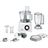 Accessoires inclus : 1 x couvercle, 1 x bras pétrisseur en plastique, 1 x cuve à pétrir en plastique, 1 x bol mixeur en plastique, 1 x râpe moyenne, 1 x fouet, 1 x support pour disques, 1 x disque/râpe à double tranchant, 1 x poussoir, 1 x couteau universel.
