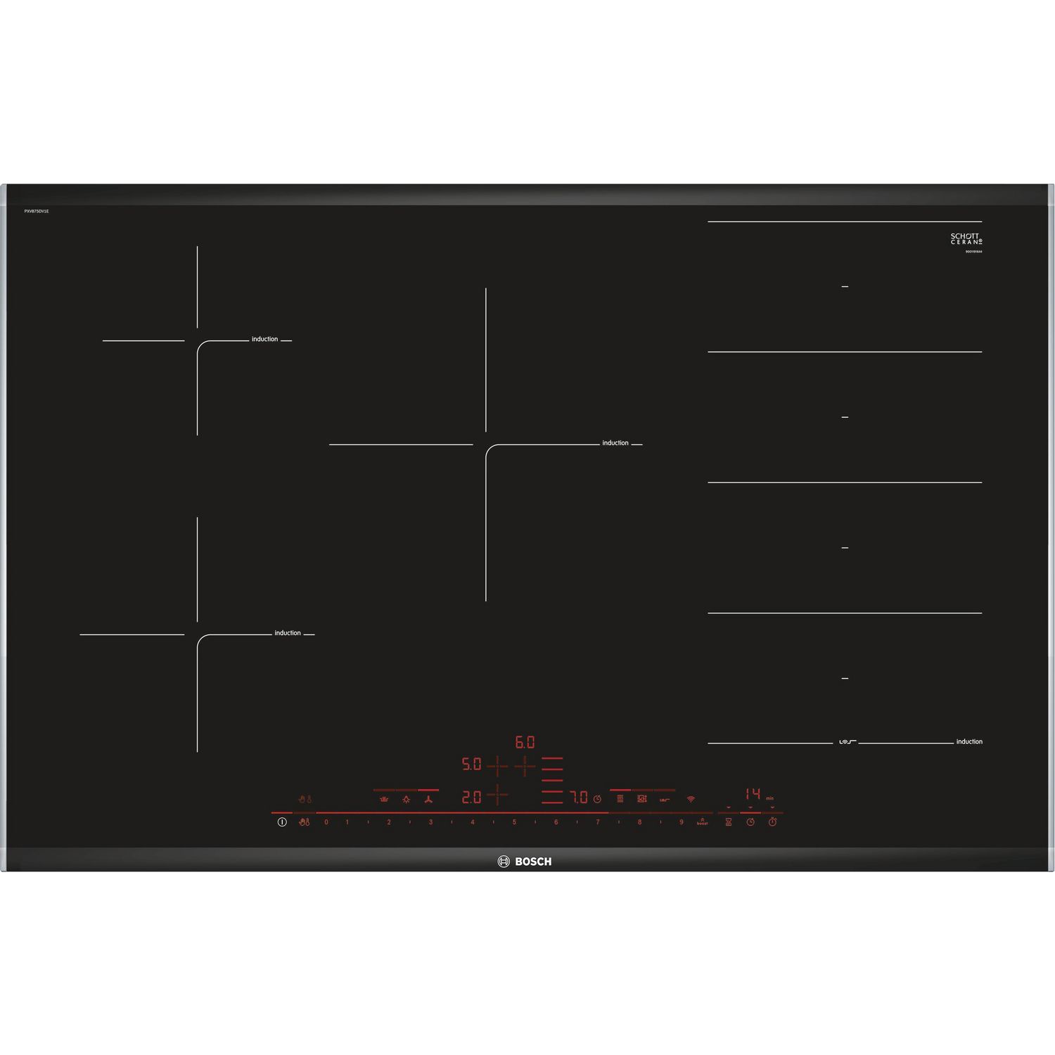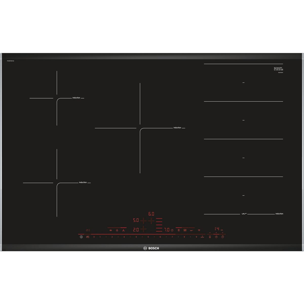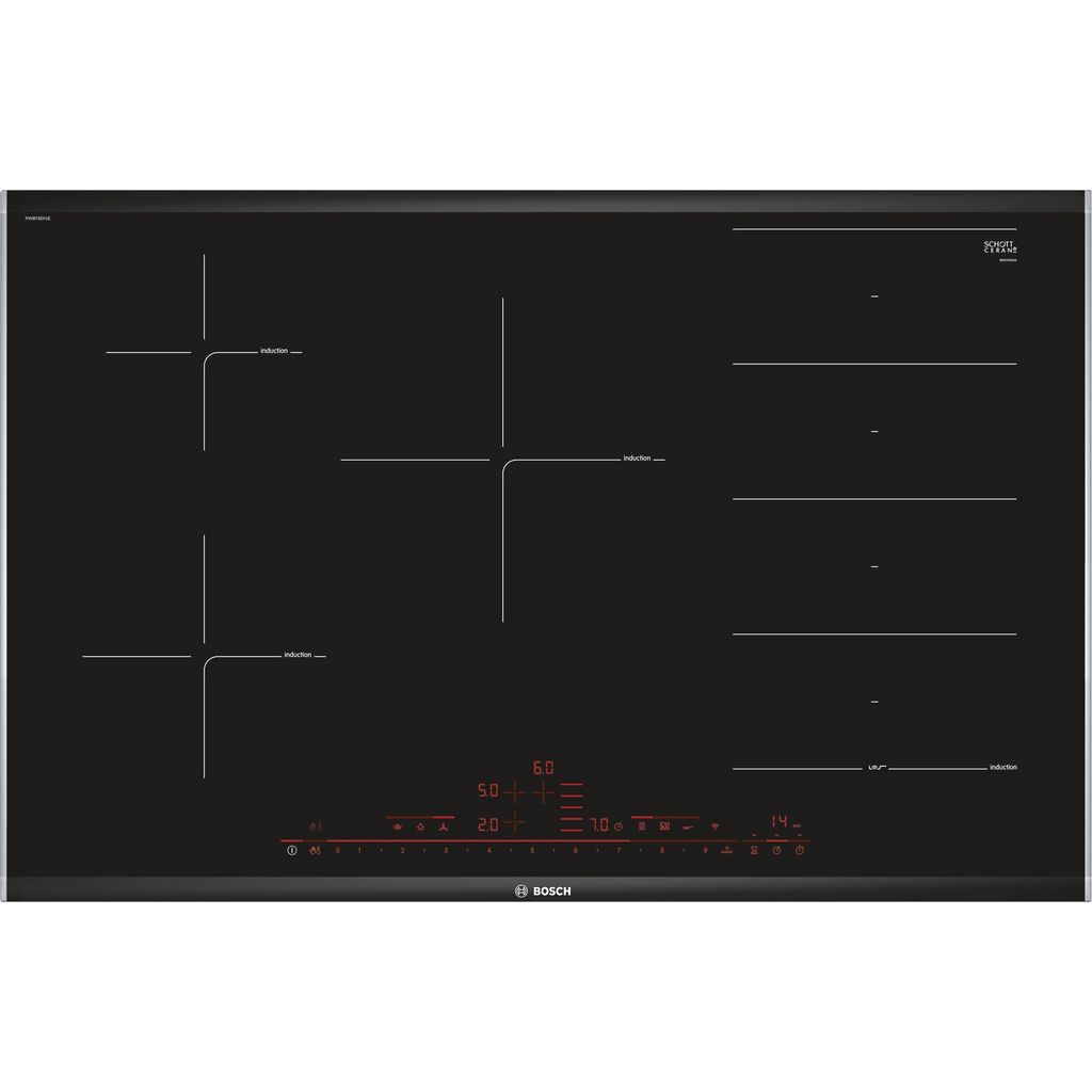 Bosch PXV875DV1E Table de cuisson à induction Série 8 Bosch PXV875DV1E abec bords biseauté à l'avant et à l'arrière, profilés sur le côté.Table induction avec PerfectFry sensor : pour des résultats de cuisson parfaits grâce au contrôle automatique de la température.DirectSelect Premium: sélection si