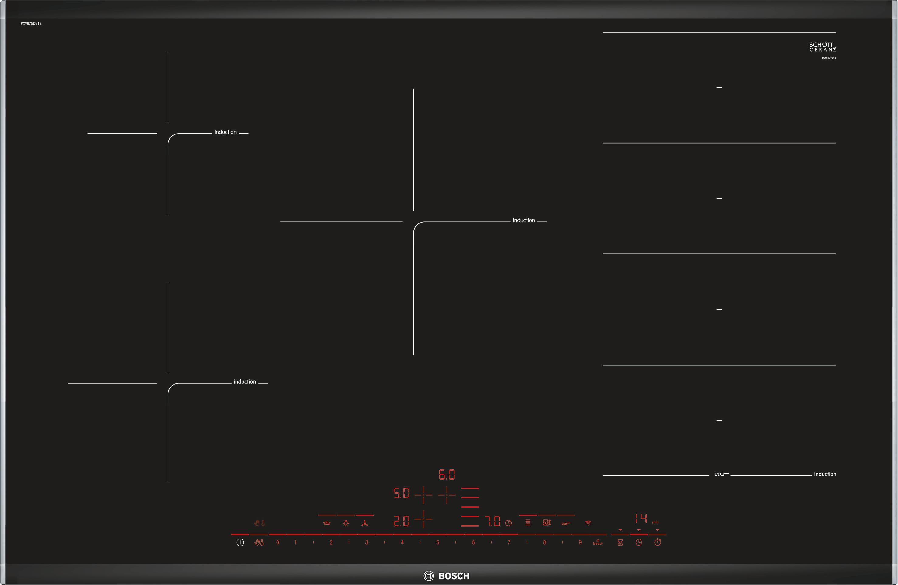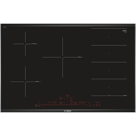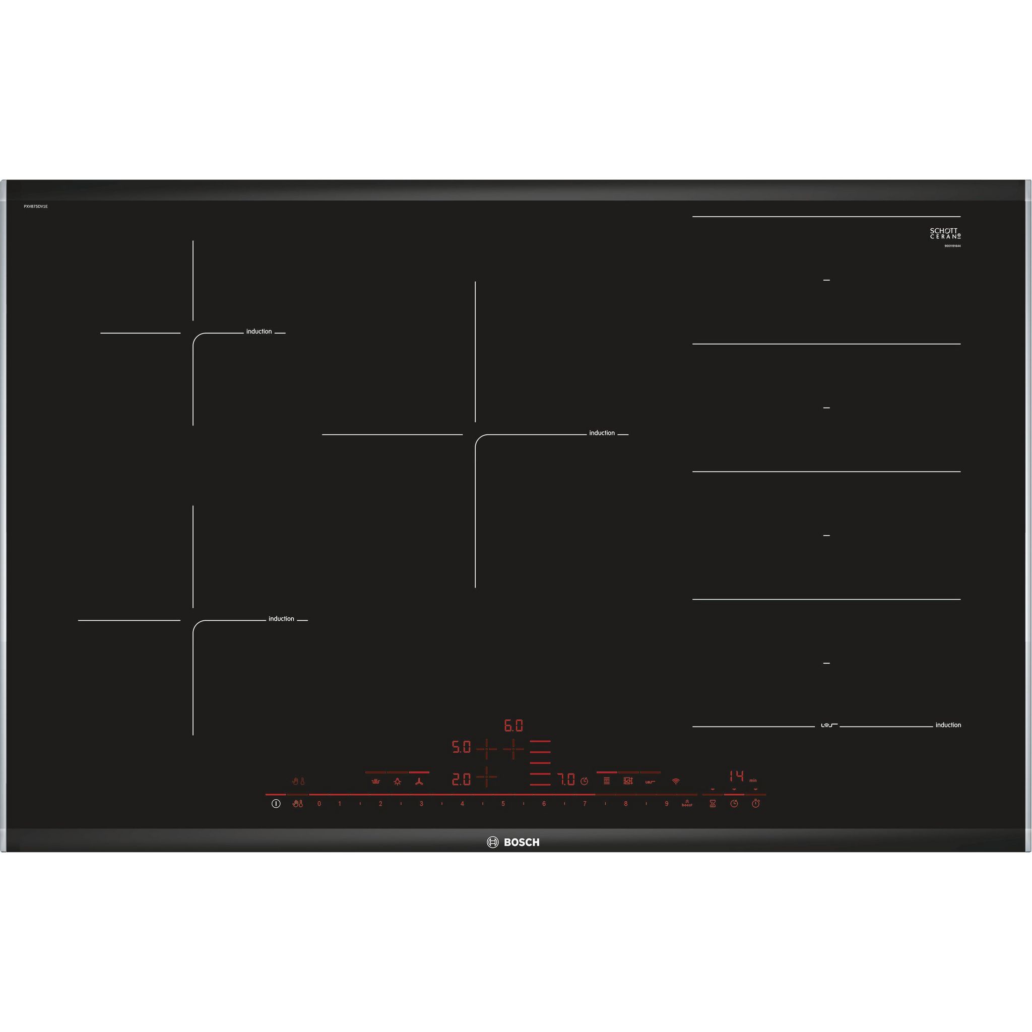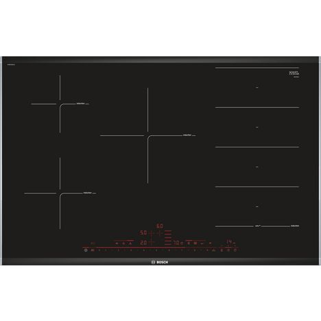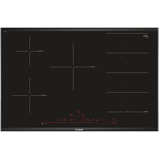 Bosch PXV875DV1E Table de cuisson à induction Série 8 Bosch PXV875DV1E abec bords biseauté à l'avant et à l'arrière, profilés sur le côté.Table induction avec PerfectFry sensor : pour des résultats de cuisson parfaits grâce au contrôle automatique de la température.DirectSelect Premium: sélection si
