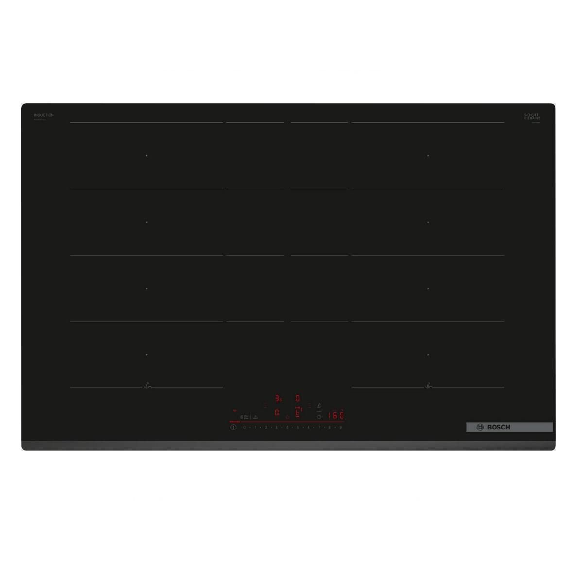 Bosch PXY83KHC1E La table de cuisson induction PXY83KHC1E de Bosch DirectSelect avec PerfectFry Plus : commande directe et simple avec capteur de température pour éviter les brûlures. Un maximum de place sur votre table de cuisson, pour les maxi marmites grâce à la technologie FlexInduction Plus. Ho