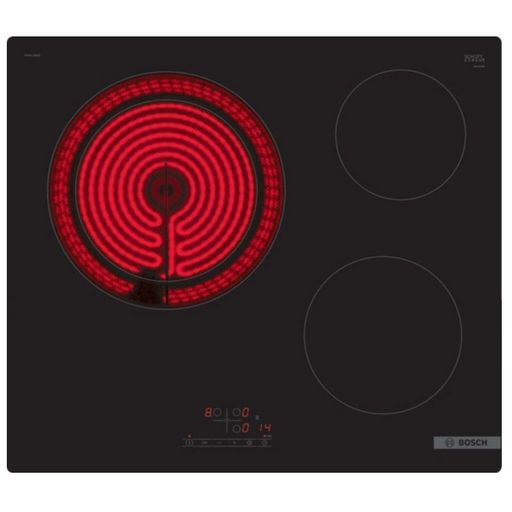 Bosch PKK611BB8E Table de cuisson radiante Série 4 Bosch PKK611BB8E en vitrocéramique : elle facilite la cuisson et le nettoyage. TouchSelect : facilité de sélection de la zone de cuisson et des niveaux de puissance. Timer avec fonction arrêt : désactive la zone de cuisson selectionnée une fois le t