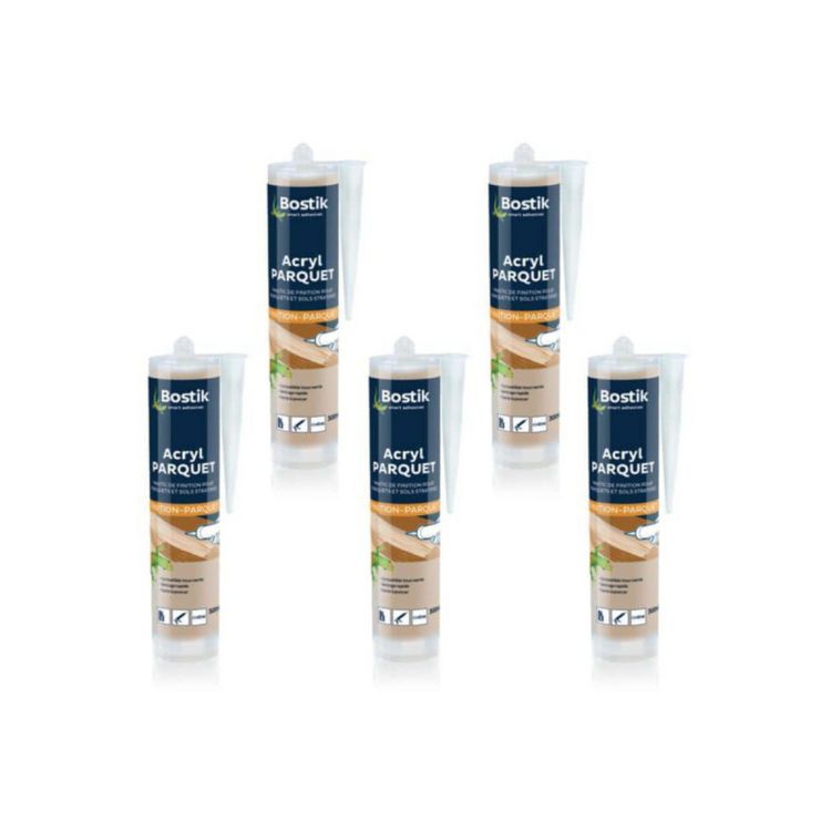 Mastic Bostik ACRYL parquet erable frêne pin 300ml x5pour des joints de finition sur parquets et sol stratifiés propre. Ce mastic vous permettra de réaliser l'obturation, le bouchage d'interstices et les défauts sur parquets bruts ou vernis.