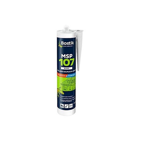 Mastic BOSTIK MSP 107 Polymère blanc collage et d'étanchéité, supports humides idéal pour le collage souple d'éléments pouvant subir des vibrations ou des chocs. Collage de tuiles, plinthes, éléments de décoration divers, de tuyaux et descentes d'eaux pluviales.Et pour les joints de dilatation, joints de fractionnement sur dalle béton, balcons, étanchéité sous appui de fenêtre, vérandas, serres.Calfeutrement de maçonneries, cloisons, huisseries en bois et métalliques, bateaux, caravanes, carrosseries.