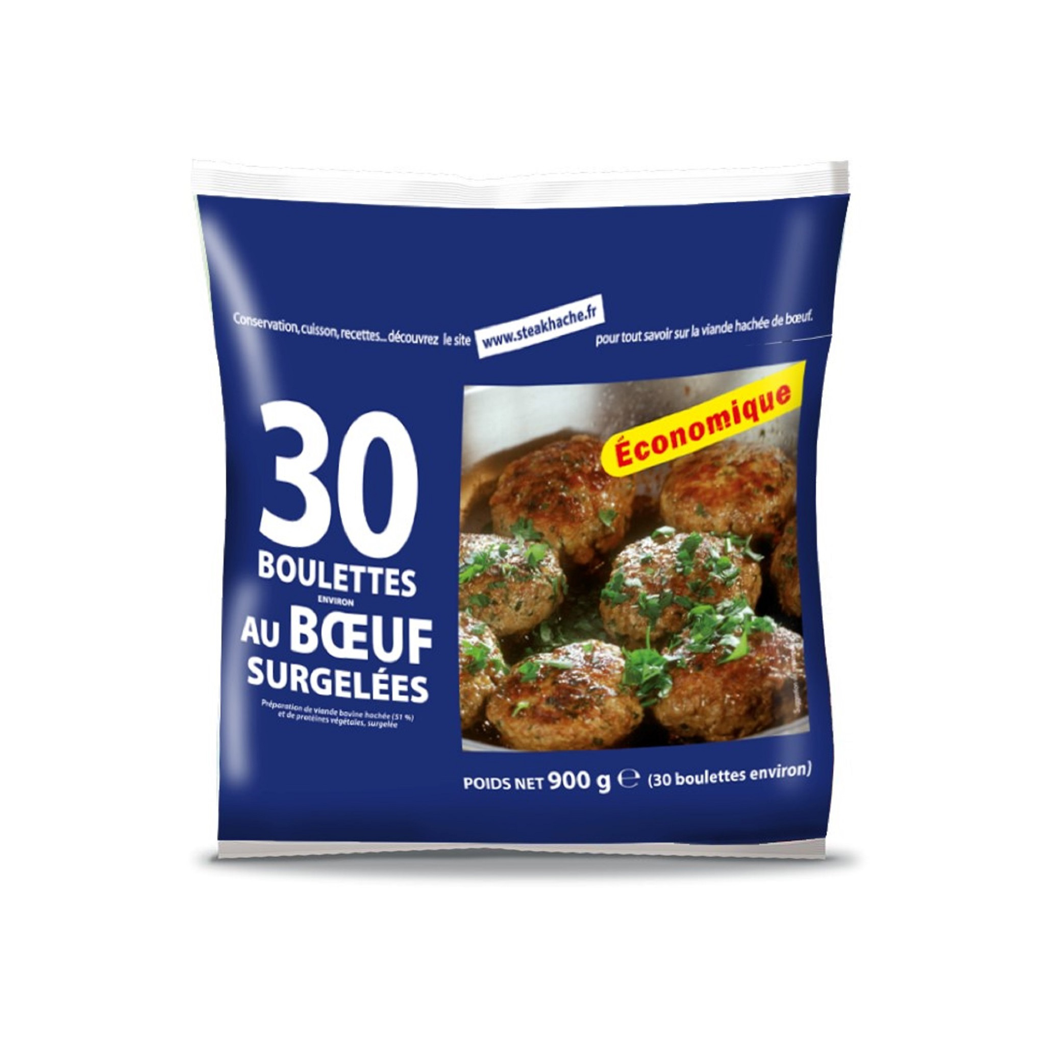 Préparation de viande bovine hachée (51%) et de protéines végétales surgelée. 30 boulettes.