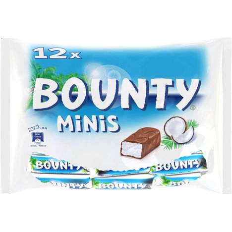 BOUNTY chocolat au lait fourré de noix de coco blanche et tendre - sachet 366g Bounty®, c'est un subtil mélange de noix de coco et de délicieux chocolat au lait pour une texture à la fois moelleuse et croustillante.