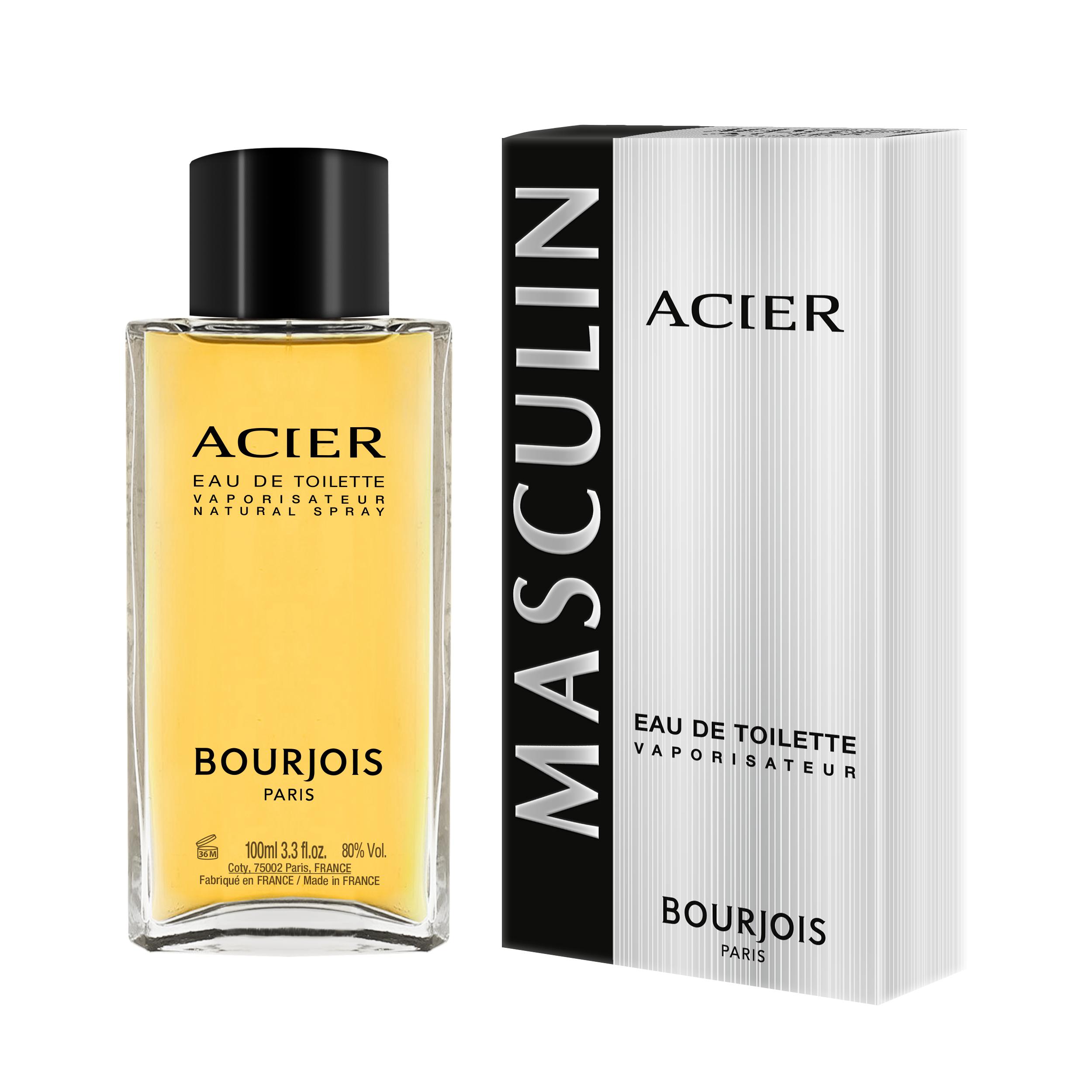 Bourjois, parfumeur depuis 1863, a créé l'Eau de Toilette Masculin Acier, une fragrance puissante et raffinée. Sa note de tête fraîche et métallique nuancée de lavande libère un coeur épicé aux accents de bois précieux et se termine sur un fond chaleureux.