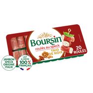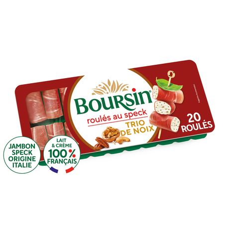 Découvrez Boursin® Apéritif Roulés Trio de Noix, de généreuses et savoureuses bouchées de fromage frais parfaitement enroulées de jambon fumé d'Italie. Fabriqués en France et déjà prêts à être déguster, les roulés raviront vos convives pour vos apéros !