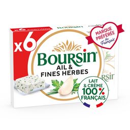 Un format portions ultra-pratique qui préserve parfaitement la fraîcheur et l'intensité du goût Ail et Fines herbes du fromage frais à tartiner Boursin®. Fabriqué en France, il est idéal sur des tranches de pain à déguster ou en apéritif.