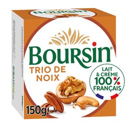 Boursin ®Trio de noix est un fromage frais à tartiner avec une recette plus intense en noix et plus gourmande. Ce fromage à tartiner à la saveur 3 noix, fabriqué en France, sera parfait pour vos plats maison cuisinés et vos apéritifs.