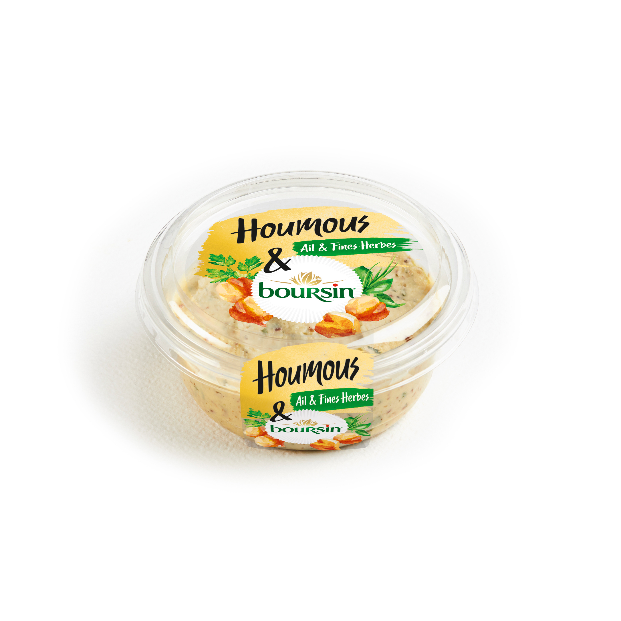 pois chiche 46%, FROMAGE (Boursin ®) 20% (LAIT et CRÈME pasteurisés (origine : France), ferments LACTIQUES), eau, huile de colza, graines de SÉSAME 5%, graines de lin 3%, fines herbes 3%, vinaigre, ail 0,7 %, sel, jus de citron, tomate, épices, acidifiant (acide lactique), conservateur (sorbate de potassium). Traces éventuelles de poisson, moutarde, crustacés, oeuf, gluten, céleri, soja, mollusques et lupin.