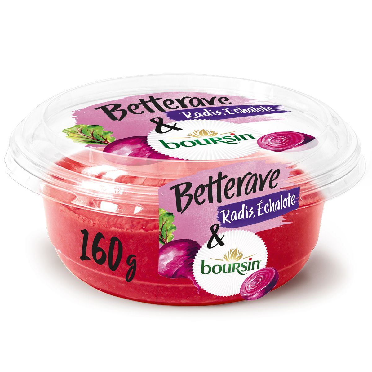 pois chiches 38%, FROMAGE Boursin® 24% (LAIT et CRÈME pasteurisés (origine : France), ferments LACTIQUES), betterave rouge 24%, graines de SÉSAME, raifort, échalote 2,4%, radis 1,2%, sel, vinaigre, acidifiants (acide lactique et acide citrique), conservateur (sorbate de potassium), extrait de paprika, stabilisants (gomme de guar), Traces éventuelles de fruits à coque (dans le fromage), poisson, moutarde, crustacés, oeuf, gluten, céleri, soja, mollusques et lupin.