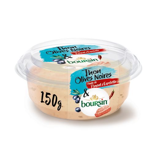 THON 47% (THON 99%, eau, sel), FROMAGE (Boursin ®) 28% (LAIT (origine : France), CRÈME, ferments LACTIQUES)), huile de colza, tomate, olives noires 3%, eau, jaune d'OEUF, échalote, ail, sel, vinaigre, fibres d'agrumes, piment d'Espelette 0,4%, sucre, MOUTARDE, poivre, acidifiants (acide lactique et acide citrique), conservateur (sorbate de potassium), stabilisant (gomme guar). Peut contenir des traces de crustacés, gluten, céleri, soja, mollusques, sésame et lupin.