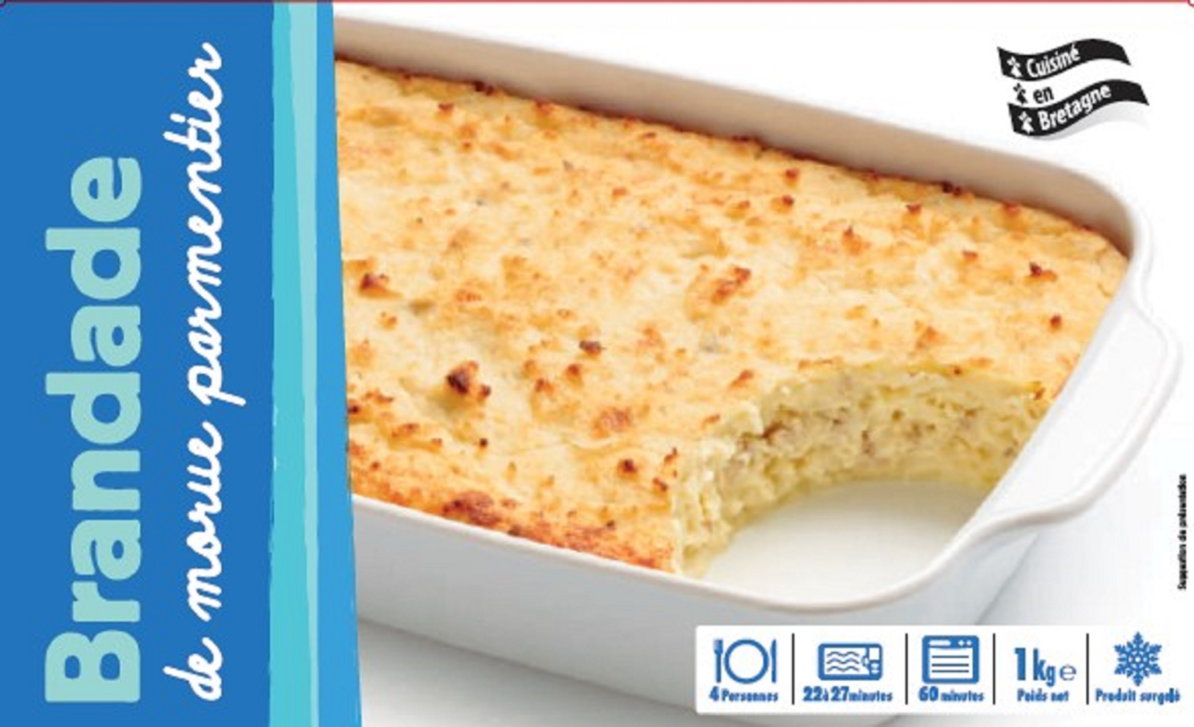 Ingrédients : Eau, morue 21% (cabillaud, sel), flocon de pommes de terre 11,1 % (pommes de terre déshydratées, émulsifiant : E471), huile de colza, lait entier en poudre, blanc d'œuf en poudre, huile d'olive vierge extra, ail, sel, curcuma.