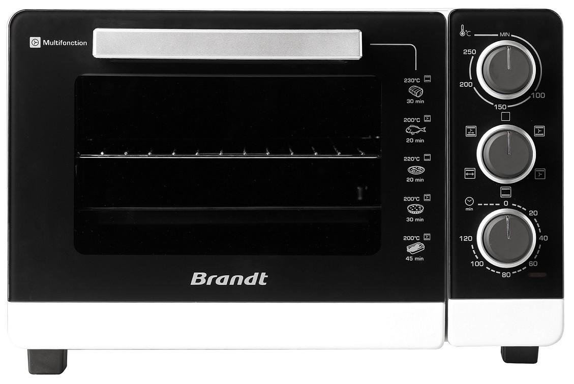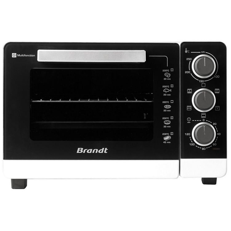 Brandt FC265MW Mini-four multifonction avec programmation mécanique Brandt FC265MW.UN FOUR COMPACT QUI A TOUT D?UN GRAND !Le mini four Brandt vous permet de réaliser une grande variété de recettes et s?intègrera parfaitement dans votre cuisine !- La multifonction avec chaleur tournante assure une cuisson homogène des préparations culinaires.- Grâce au tournebroche, réalisez de délicieuses préparations de volailles !- Pratique, il est doté d?une minuterie de 2 heures pour vous avertir de la fin de la cuisson.- Utile, le guide de cuisson en façade vous aidera à concocter vos recettes !DES ATOUTS SUPPLEMENTAIRES !En plus de ses 5 modes de cuisson, le mini four Brandt possède aussi d?autres atouts : 3 commandes mécaniques douces au touché et 4 niveaux de gradins !LA FACILITE DE NETTOYAGE !Enfin, le nettoyage de la cavité est facilité grâce à sa surface anti-adhérente !