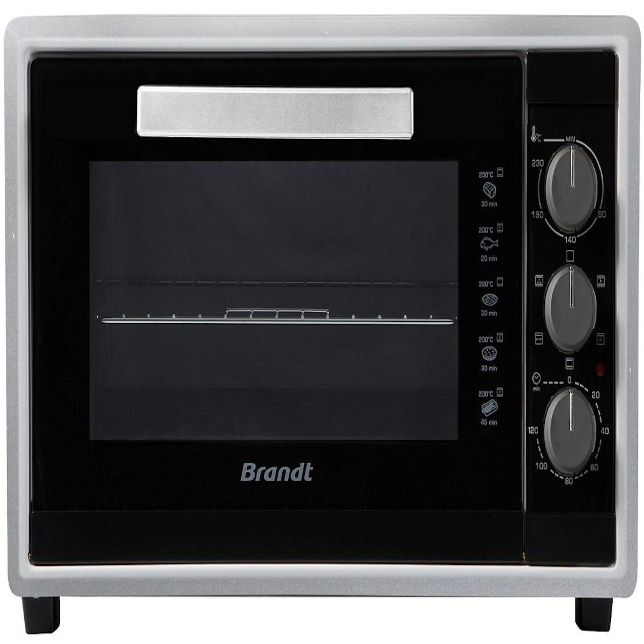 Brandt FC4500MS Four multifonction Brandt FC4500MS doté de 5 modes de cuisson : Cuisson multifonction, Four traditionnel, Tournebroche, Gril, Sole. Four compact mécanique avec 3 manettes soft touch : 1 thermostat, 1 minuteur et 1 sélecteur de mode de cuisson. - Type : Minifour et rôtissoire.Capacité